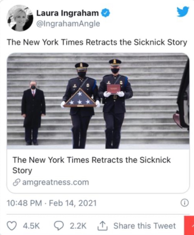 La cobertura sensacionalista de la muerte de Sicknick por parte del New York Times fue una de las más influyentes en su momento, con el incendiario titular de Muere un agente de la policía del Capitolio por las heridas sufridas en un ataque pro-Trump.