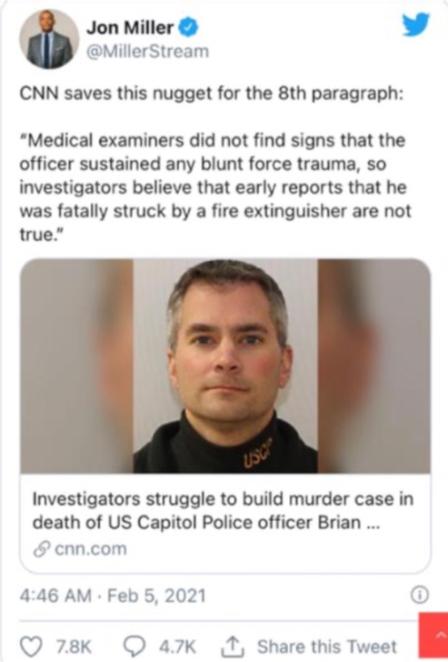 Las cosas empezaron a aclararse después de que la CNN informara de que los investigadores no podían construir un caso de asesinato en torno a la muerte del oficial Sicknick, ya que los informes de haber sido golpeado con el extintor no eran ciertos.