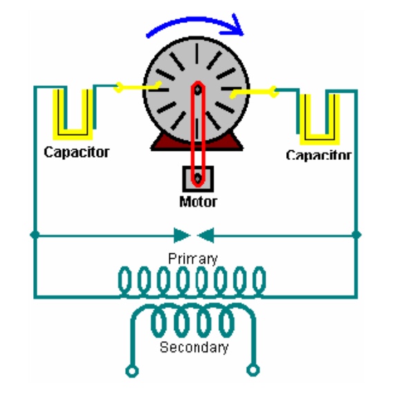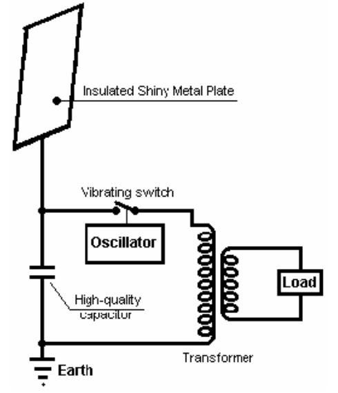 Este sistema de Tesla recoge energía día y noche. El condensador se carga y un interruptor vibratorio descarga repetidamente el condensador en el transformador reductor. El transformador reduce el voltaje y aumenta la corriente disponible y la salida se utiliza para alimentar la carga eléctrica.