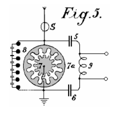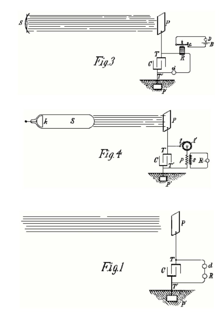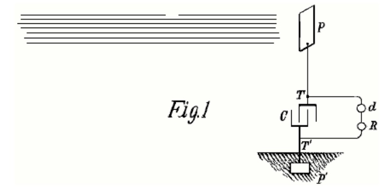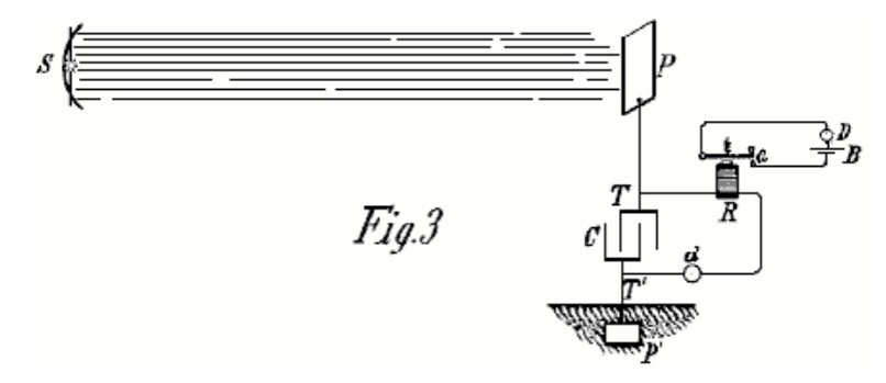 Si se emplean corrientes alternas simétricas ordinarias, se debería prever que los rayos caigan sobre la placa P sólo durante los períodos en los que pueden producir el resultado deseado. Obviamente, si la radiación de la fuente se detiene o intercepta, o si la intensidad varía de alguna manera, como interrumpir periódicamente o variar rítmicamente la corriente que excita la fuente, habrá cambios correspondientes en la acción sobre el receptor R y, por lo tanto, las señales se pueden transmitir y muchos otros efectos útiles producidos. Además, se entenderá que cualquier forma de cierre de circuito que responda o se ponga en funcionamiento cuando se almacena una cantidad predeterminada de energía en el condensador, puede usarse en lugar del dispositivo ya descrito en relación con la figura 2. La segunda patente requiere que el equipo esté sintonizado a un cuarto de la longitud de onda de los pulsos de energía que se recolectan.