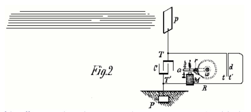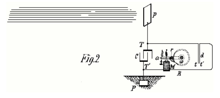 En la ilustración de este efecto, la figura 2 muestra la misma disposición general que la figura 1, y el dispositivo d se muestra compuesto por dos placas conductoras t y t ‘muy delgadas que se mueven libremente y están colocadas muy cerca una de la otra. La libertad de movimiento puede ser por la flexibilidad de las placas o por el carácter de su soporte. Para mejorar su acción, deben estar encerrados en una carcasa en la que se pueda extraer el aire. Las placas t y t ‘están conectadas en serie en un circuito de trabajo que incluye un receptor adecuado, que en este ejemplo se muestra como un electroimán M, una armadura móvil a, un resorte b y una rueda de trinquete w, provista de un resorte. -trinquete r, que se pivota para la armadura a como se ilustra. Cuando la radiación cae sobre la placa P, una corriente fluye hacia el capacitor hasta que su voltaje hace que las placas t y t ‘se atraigan juntas, cerrando el circuito y energizando el imán M, lo que hace que baje la armadura ay provoque una rotación de la rueda de trinquete w. Cuando se detiene el flujo de corriente, el resorte b retrae el inducido, sin embargo, sin mover la rueda w. Con la interrupción de la corriente, las placas t y t ‘dejan de ser atraídas y separadas, restaurando así el circuito a su estado original.
