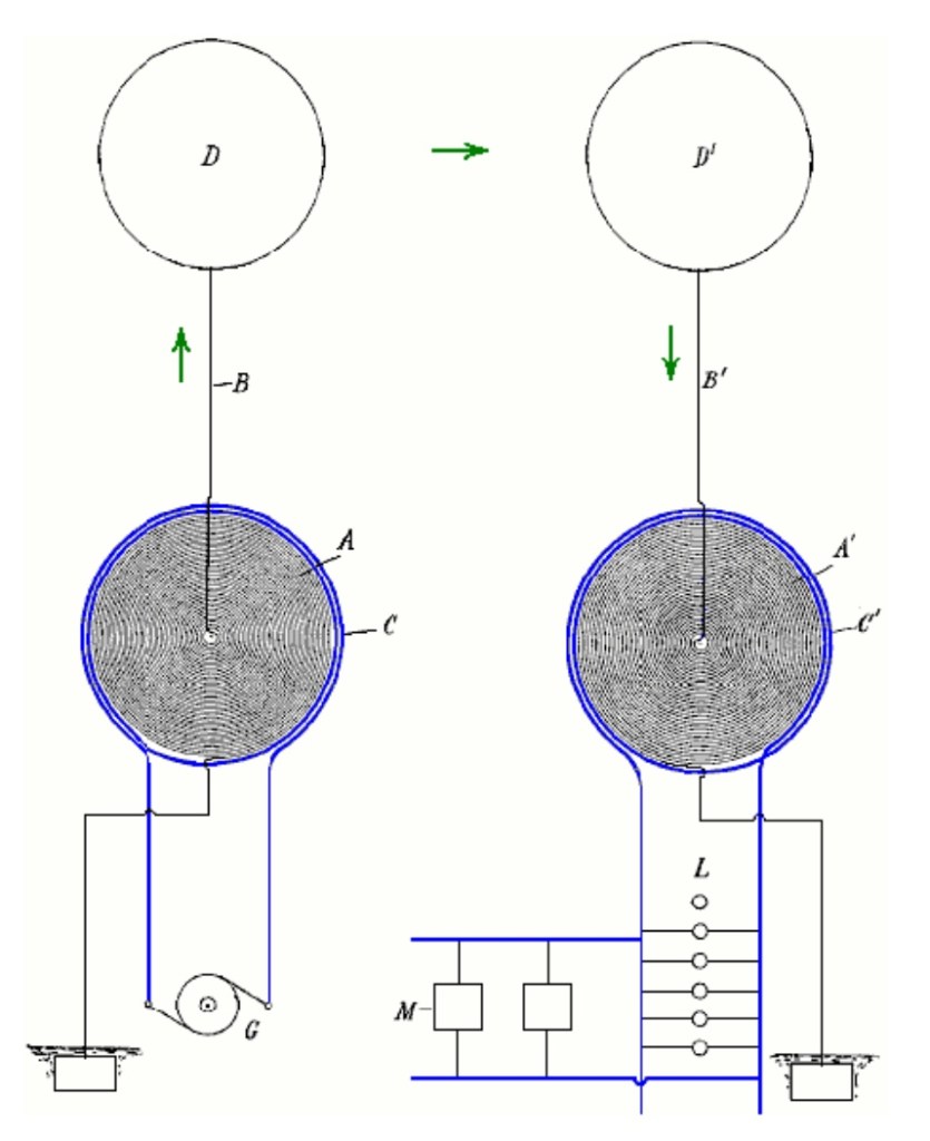 Para una frecuencia tan baja, a la que solo se recurrirá cuando sea indispensable para el funcionamiento de motores ordinarios, usaría un devanado secundario devanado de un cable de 50 millas de longitud. Al ajustar la longitud del cable en el devanado secundario, los puntos de mayor voltaje se hacen coincidir con los terminales elevados D y D ‘, y debe entenderse que cualquiera que sea la longitud del cable que se elija, este requisito de longitud debe cumplirse con el fin de para obtener los mejores resultados posibles. Se entenderá fácilmente que cuando existen estas relaciones, se alcanzan las mejores condiciones para la resonancia entre los circuitos de transmisión y recepción y debido al hecho de que los puntos de voltaje más alto en las bobinas A y A ‘coinciden con los terminales elevados, el El flujo máximo de corriente se producirá en las dos bobinas y esto implica que la capacitancia e inductancia en cada uno de los circuitos tengan los valores que produzcan el sincronismo más perfecto con las oscilaciones.
