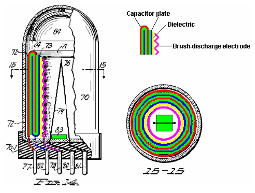 El tubo que se muestra arriba tiene un condensador de seis capas formado por dos anillos metálicos circulares en forma de U con el espacio entre ellos lleno de un material dieléctrico. Las placas se muestran en rojo y azul, mientras que el dieléctrico se muestra en verde. Dentro del condensador, hay un anillo separado de material dieléctrico (posiblemente hecho de un material diferente) y un anillo interior de metal corrugado para formar un electrodo de descarga de cepillo de iones. Las conexiones del condensador y el electrodo se llevan a los pines en la base del tubo. Se sugiere cuarzo para el material de la cubierta exterior del tubo y se dice que el elemento de alambre numerado 79 en el diagrama es un elemento calefactor destinado a ser alimentado por una fuente de corriente de bajo voltaje. Sin embargo, como a Moray se le negó una solicitud de patente anterior alegando que no había ningún elemento calefactor en sus tubos, es claramente posible que el elemento calefactor que se muestra aquí sea falso y esté dibujado únicamente para evitar el rechazo de los examinadores. En su patente, Moray se refiere al capacitor en este tubo como un capacitor «chispeante», por lo que puede haberlo estado conduciendo con voltajes excesivamente altos que causaron roturas repetidas del material del capacitor.