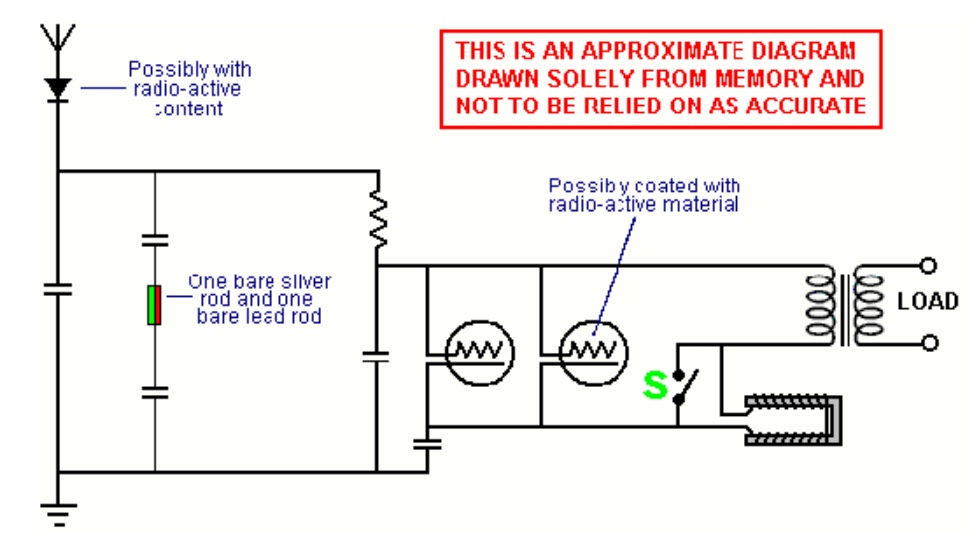 El diagrama que se muestra arriba se reproduce a partir de un boceto dibujado de memoria después de ver el diagrama de circuito de Moray. La persona que lo dibujó no entiende cómo funciona el circuito, así que trate este diagrama como una sugerencia general de cómo podría haber sido el circuito de Moray. En realidad, es mucho más probable que se tratara de una cascada de pares de circuitos de tanques que contienen la válvula de Moray, cada par es un circuito de tanque en serie seguido de un circuito de tanque paralelo, la frecuencia de oscilación cae con cada par de tanques y la potencia de salida aumenta con cada tanque. par. El circuito de Moray comenzó a oscilar acariciando la bobina en forma de U con un imán permanente durante unos segundos, y cuando el circuito comenzó a funcionar, el interruptor ‘S’ se cerró, retirando efectivamente la bobina en forma de U del circuito. Moray pudo demostrar que nada de la energía de salida provenía de su dispositivo. Internamente, el dispositivo estaba eléctricamente muerto cuando no se había conectado y sintonizado con la antena.