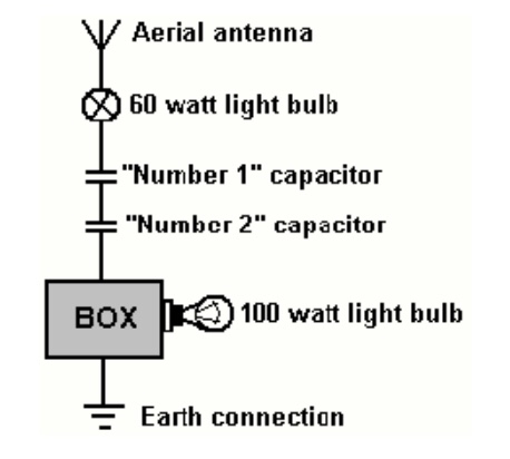 Con la lámpara de 60 vatios y los dos condensadores conectados a la antena y la antena y la tierra conectadas a la caja que contiene el equipo de energía radiante como se muestra en el dibujo, se encendió la lámpara de 100 vatios en el lado secundario o de salida. Desenroscar la lámpara de 60 vatios de su portalámparas hizo que el amplificador de 100 vatios se apagara, pero se encendió inmediatamente cuando la lámpara de 60 vatios se volvió a enroscar en su portalámparas. La lámpara de 60 vatios no se encendió. Cortar la antena y la tierra colocando un cable a través de ellos hizo que la lámpara de 100 vatios se apagara. Un cortocircuito similar con las manos también hizo que se apagara la lámpara de 100 vatios. No se podía sentir electricidad al hacer un cortocircuito con las manos. Si los cables de la antena o de tierra se desconectaran de la caja, la lámpara de 100 vatios se apagaría. Ninguno de los condensadores o la lámpara de 60 vatios en el lado primario de la caja eran necesarios, sino que simplemente se colocaron allí para mostrar que la potencia de alta frecuencia saltará o pasará a través de ellos.