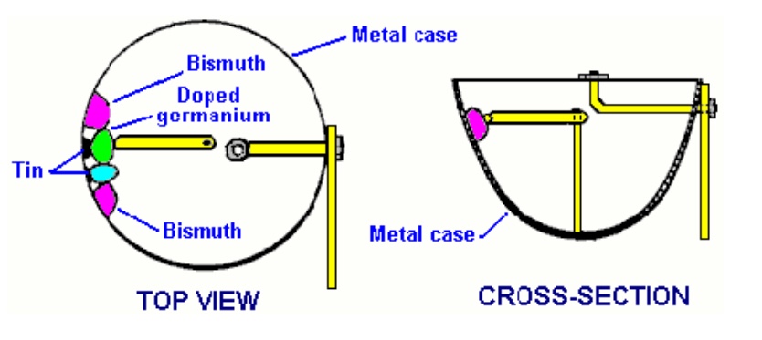 Se supone que esta es la información de construcción de la válvula Moray que se podía configurar para rectificar una señal o amplificar una señal. La carcasa es una copa de metal que también forma uno de los contactos de la válvula. dentro de la taza hay cuatro gránulos adheridos a un lado. Los dos gránulos exteriores están hechos de bismuto y se fusionan directamente sobre la caja de metal. Los dos gránulos internos están unidos a la caja con estaño en lugar de soldadura. A juzgar por el dibujo, parece que el brazo de metal que entra en contacto con los gránulos solo puede conectarse con los dos gránulos internos. El brazo presiona fuertemente contra los perdigones de la misma manera que los diodos de «bigotes de gato» de la época se tocaban con un alambre de plata para hacer un punto de contacto y producir una rectificación. Si es correcto que el brazo giratorio solo contacta con uno de los dos gránulos internos, entonces el motivo de esos gránulos de bismuto externos debe ser una parte indirecta de la válvula. Entonces, esta sección de la caja es una disposición del metal de la caja, estaño, bismuto y cinco uniones entre diferentes materiales, sin contar el brazo de contacto. Uno de los dos gránulos internos está hecho de germanio purificado con la adición de cantidades muy pequeñas de un material de dopaje. Se han utilizado sulfuro de hierro (FeS), sulfuro de molibdeno (MoS), bismuto, uranio y plata mencionados como posibles agentes dopantes.