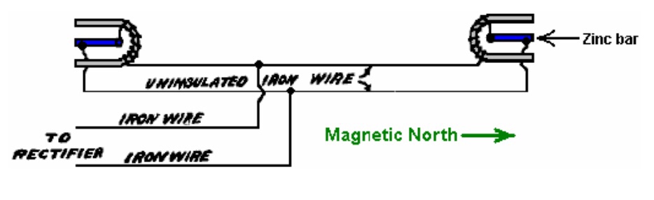 El cable de la antena se colocó sin ninguna ayuda o instrucciones de parte del Sr. Moray, excepto que sugirió que el cable se estire más para evitar que se doble tanto en el centro. Esto se hizo y el cable pareció despejar el suelo unos 7 u 8 pies en su punto más bajo. La tubería de tierra era una tubería de agua de media pulgada que constaba de dos secciones. La sección inferior estaba apuntada al final para facilitar la conducción hacia el lecho del arroyo. Tenía alrededor de 6 pies de largo y después de ser empujado hacia abajo alrededor de 5 pies, la segunda sección, que tenía aproximadamente 4 pies de largo, se atornilló con una llave y la tubería se empujó más abajo hasta que golpeó un objeto duro, por lo que aproximadamente 7 pies de tubería estaba en el suelo. El cable de la antena se aisló de los postes con dos aislantes de vidrio de aproximadamente 6 pulgadas de largo y con orificios en ambos extremos. Un trozo de cable de aproximadamente 2 pies de largo conectaba cada aislador con el poste. El cable de entrada se sujetó al cable de la antena en un punto a unos 10 o 15 pies del polo este. Ayudé al Sr. Moray a soldar la conexión. Calculé la distancia entre los dos postes de la antena y calculé que era de 87 pies.