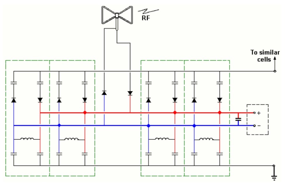En una implementación de la invención, este circuito se duplica para cada línea de salida positiva y negativa. En otro, el circuito está acoplado a circuitos idénticos adicionales para aumentar la salida de corriente continua de la disposición. En otra implementación, la antena utilizada es una antena dipolar de alambre de aluminio dispuesta en una configuración de «mariposa».