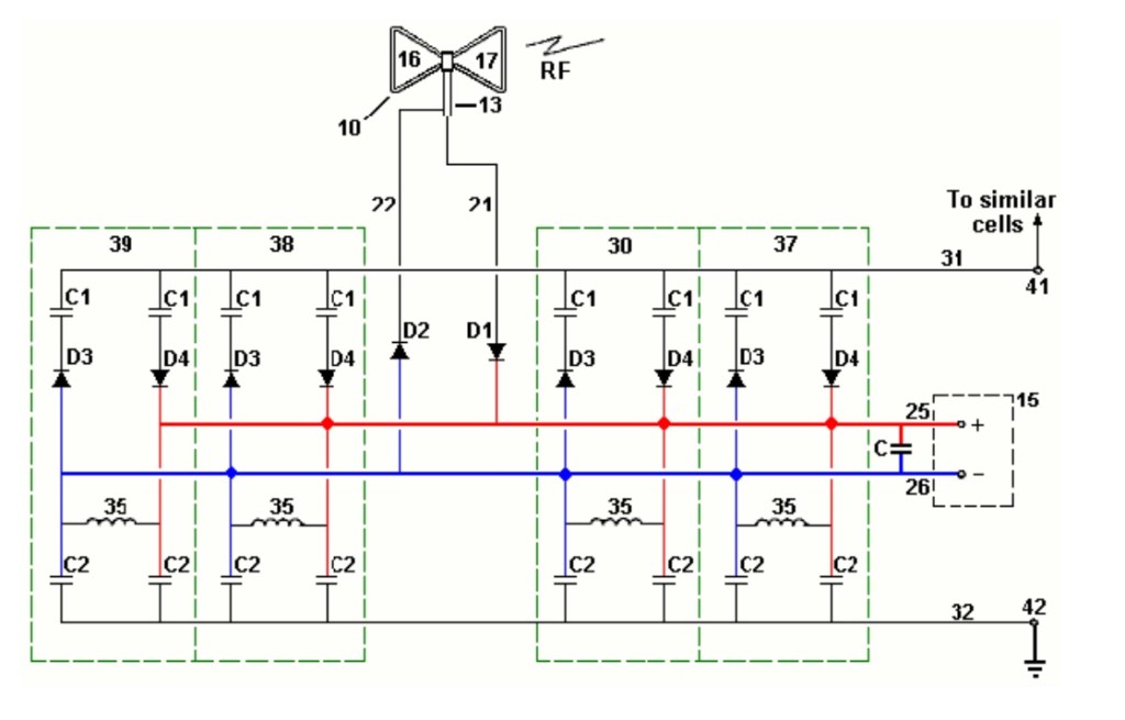 El número particular de celdas 30 y el valor de los componentes en él, están determinados por la configuración de la antena dipolo 10 y la potencia y frecuencia del transmisor de RF. Este circuito de conversión de radiofrecuencia a corriente continua puede conectarse a un circuito duplicado a través del pin 41 para proporcionar una salida de corriente continua adicional en líneas similares a la línea de salida positiva 25 y la línea de salida negativa 26.Las líneas de salida pueden conectarse juntas para impulsar la producción total del sistema. Una realización operativa de la invención utiliza los siguientes elementos: Diodos: D1, D2, D3 y D4 – Diodos de germanio, tipo 1N34A, Inductores: 35-47 milihenry Condensadores de choque RF: C1 y C2 – 0.47 Pico Faradios a 200 voltios Cable coaxial: Antena Dipolar de 13 a 50 ohmios: bucles triangulares de alambre de aluminio de aproximadamente 30 x 45 cm. A partir de la descripción anterior, un experto en la técnica puede determinar fácilmente las características esenciales de esta invención, y sin apartarse del espíritu y alcance de la misma, puede realizar diversos cambios y modificaciones de la invención para adaptarla a diversos usos y condiciones.