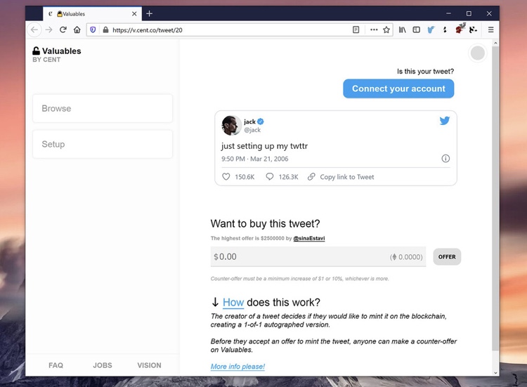 El funcionamiento de Valuables es sencillo: los usuarios compran y venden esos activos que se subastan mediante pagos en Ethereum, y la operación queda registrada en la cadena de bloques de esta plataforma, en la que queda patente que un comprador adquiere un tuit «autografiado» por su creador que luego puede vender a quien lo quiera a su vez comprar.