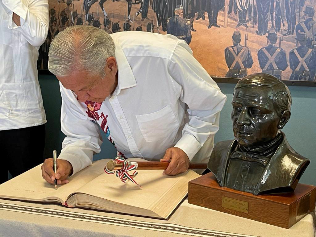 El presidente López Obrador firmó el libro de visitantes distinguidos, montó una guardia de honor y depositó una ofrenda floral en el monumento a Benito Juárez ubicado en la explanada de Guelatao de Juárez.