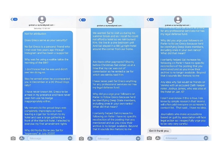 Diré lo que he dicho ahora docenas de veces antes: de ninguna manera estaba involucrado o al tanto de ninguna persona o esquema para cometer ningún acto ilegal en el Capitolio o en cualquier lugar de DC, ya sea el 6 de enero o cualquier otro día, nunca. El Daily News simplemente está persiguiendo la vengativa sed de sangre que se ha desencadenado entre los propagandistas adilados por Trump a raíz de mi perdón. Este deseo de venganza y el cumplimiento de mi linchamiento por parte de sus compañeros de viaje corruptos en una farsa de la corte de canguro ahora está alimentando sus insinuaciones e implicaciones infundadas, si no ridículas, que yo o Sal Greco o alguien que conozca o haya conocido tenía algún conocimiento o participación en una conducta ilegal el 6 de enero.