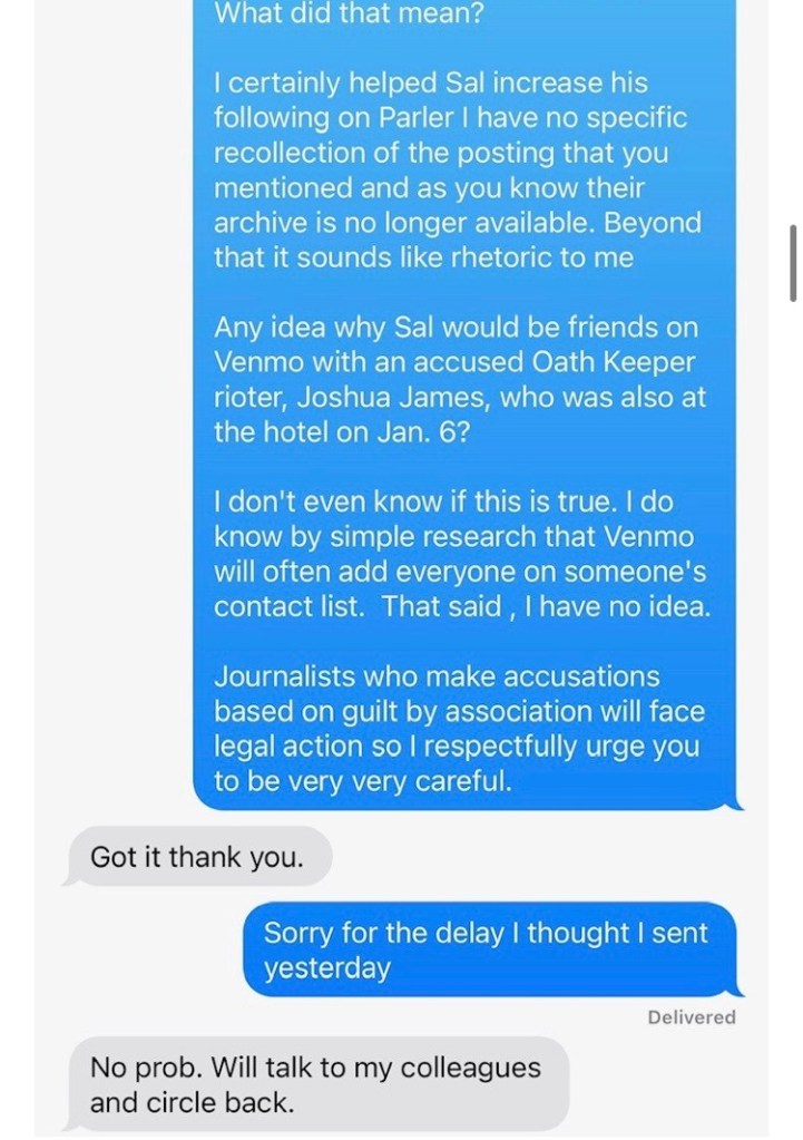 El 5 de enero, Sal estuvo conmigo en Washington DC, acompañándome mientras hablaba en dos eventos legalmente permitidos. El 6 de enero ni siquiera salimos de la propiedad del Hotel Willard todo el día. Ninguno de nosotros estuvo en la Elipse, en la marcha al Capitolio, o presente en el Capitolio por ninguno de los actos ilegales. Ambos estábamos conmocionados y horrorizados por la violencia sin ley y políticamente contraproducente en el Capitolio mientras la veíamos desarrollarse en la televisión en mi suite de hotel.