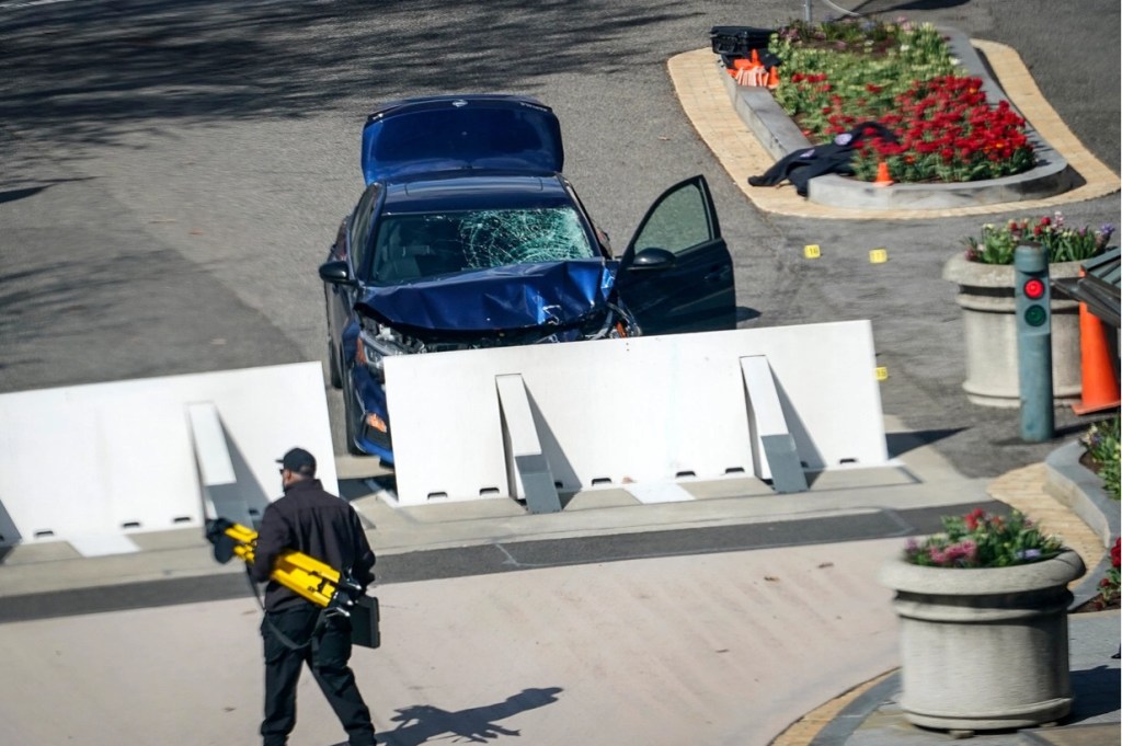 Una foto de la escena tomada poco después del incidente muestra un sedán azul oscuro con la parte delantera arrugada contra una barricada emergente de metal blanco con las palabras «STOP» en rojo.