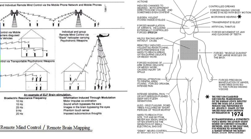 - Escucha microondas (esta nota tiene un asterisco que conecta con una nota en la parte inferior de la columna de la derecha. Dice: La primera transmisión exitosa desclasificada de la voz humana directamente al cráneo de una persona viviente fue realizada por el Dr. Joseph C. Sharp, del Instituto de Investigación del Ejército Walter Reed, en 1974. Al transformar una voz de un hipnotizador usando el sonido bajo silente o métodos de mezcla Smirnov, usados en la guerra del golfo, es posible hipnotizar un objetivo sin que el objetivo note que se le está ocultando el hipnotismo, dejando cero trazo de evidencia).