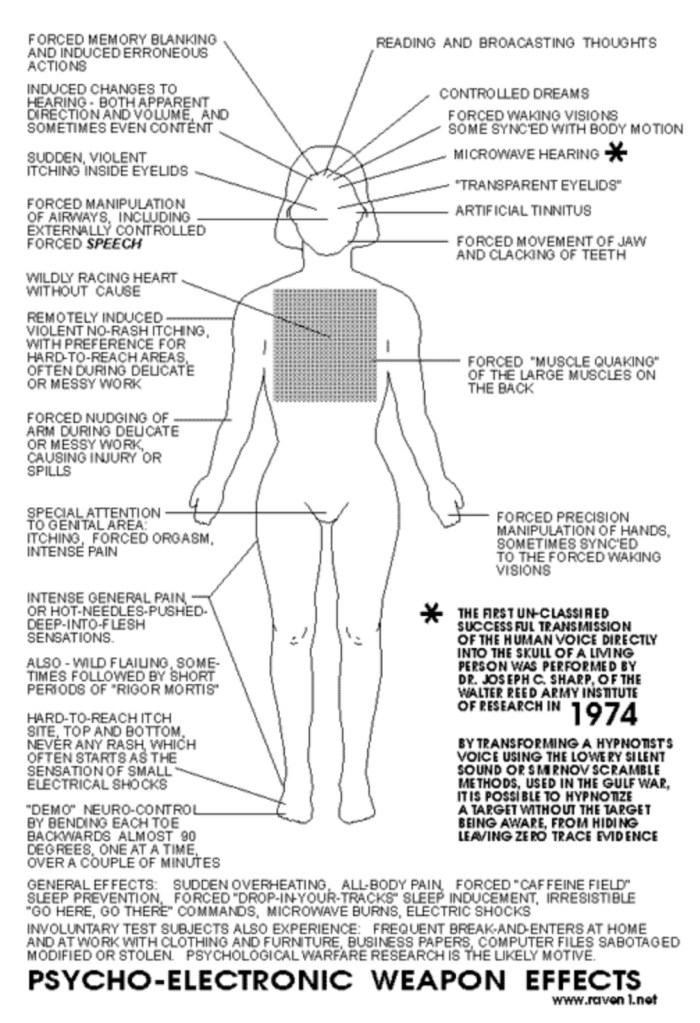 Efectos generales: sobrecalentamiento repentino, dolor en todo el cuerpo, prevención del sueño forzada «campo cafeína», inducción forzada del sueño «cáete en acción», órdenes irresistibles «ve aquí, ve allá», ardor microondas, shocks eléctricos.