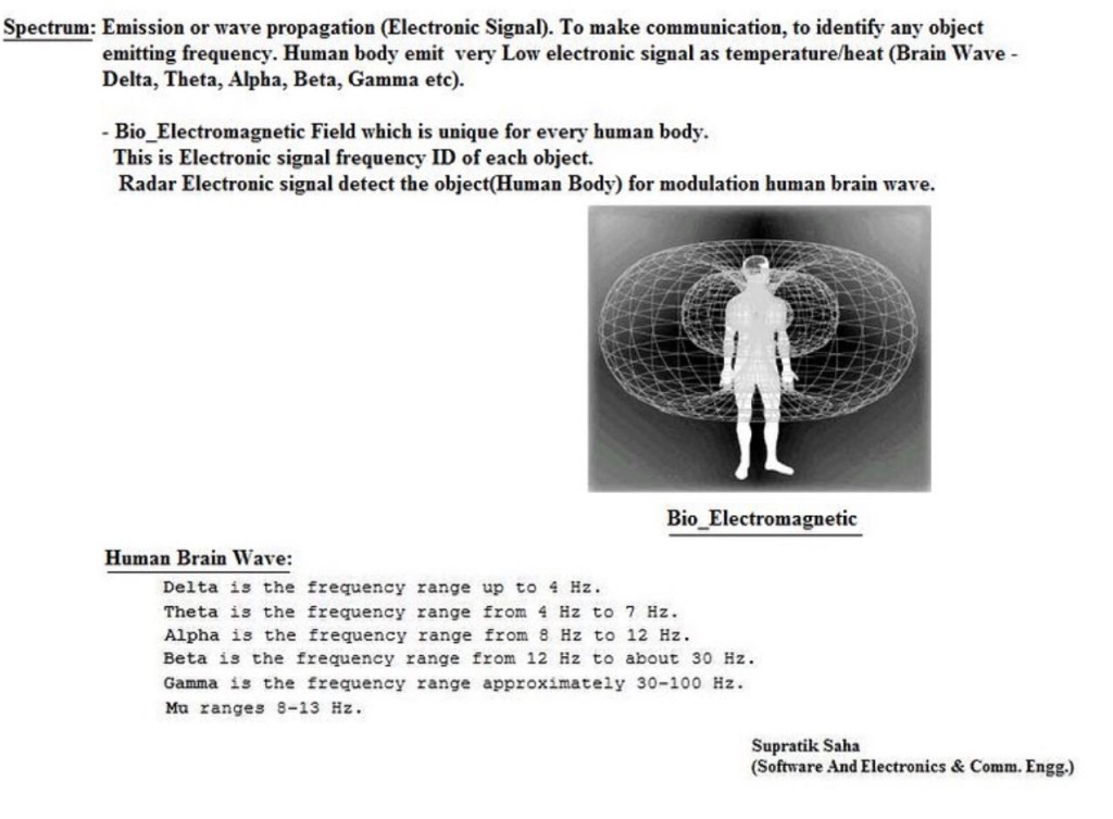 Espectro: Emisión u onda de propagación (Señal Electrónica). Para hacer comunicación, para identificar cualquier objeto emitiendo frecuencia. El cuerpo humano emite una señal electrónica muy baja como temperatura/calor (Onda cerebral – Delta, Theta, Alfa, Beta, Gama, etc.).