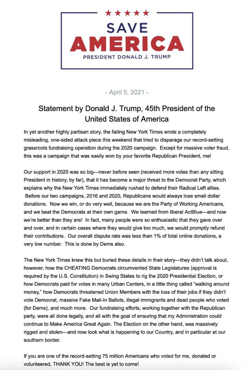 En otro artículo sumamente partidista, el fallido New York Times escribió este fin de semana una historia de ataque unilateral completamente engañosa que intentó desacreditar nuestra operación de recaudación de fondos de base la cual estableció récords durante la campaña del 2020. Excepto por el fraude electoral masivo, esa fue una campaña que fue ganada fácilmente por tu presidente republicano favorito, ¡yo!