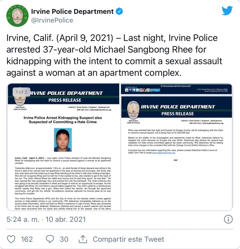 La policía de Irvine arrestó a Michael Sangbong Rhee, un hombre asiático de 37 años, el viernes por la noche por secuestro con la intención de cometer una agresión sexual contra una mujer asiática. En un comunicado de prensa, la policía de Irvine dijo que Rhee obligó a la mujer a punta de pistola a entrar en la parte trasera de su automóvil cuando estaba afuera de su complejo de apartamentos el jueves por la tarde. Después de cometer «agresión sexual» contra la mujer, Rhee huyó cuando alertó a un trabajador de mantenimiento cercano. Rhee fue arrestado más tarde y actualmente se encuentra detenido con una fianza de $ 1 millón. En su apartamento se encontró una pistola de aire comprimido similar al arma descrita por la víctima.