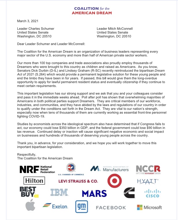 En una carta de marzo enviada al líder de la mayoría del Senado Chuck Schumer (D-NY) y al líder de la minoría del Senado Mitch McConnell (R-KY), los ejecutivos de las corporaciones instaron al Senado a aprobar la amnistía expansiva.