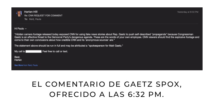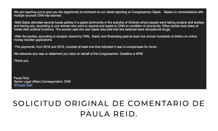 Pero Reid también incluye la absoluta falsedad, en su artículo, de que «un portavoz de Gaetz no respondió directamente a la solicitud de comentarios de CNN, sino que cuestionó el uso de fuentes anónimas».
