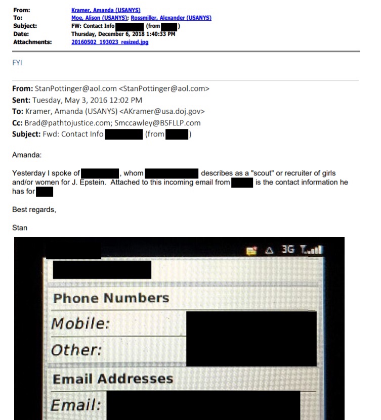 Correo electrónico de 2016 al DOJ que proporciona información de contacto de un reclutador de Epstein.