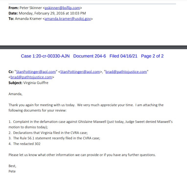 2016 Correo electrónico a Amanda Kramer del DOJ (de los abogados de la víctima) sobre los desarrollos en el caso Maxwell y agradeciendo a Kramer por reunirse con ellos. A Kramer del DOJ se le ofrece más información si la necesita.