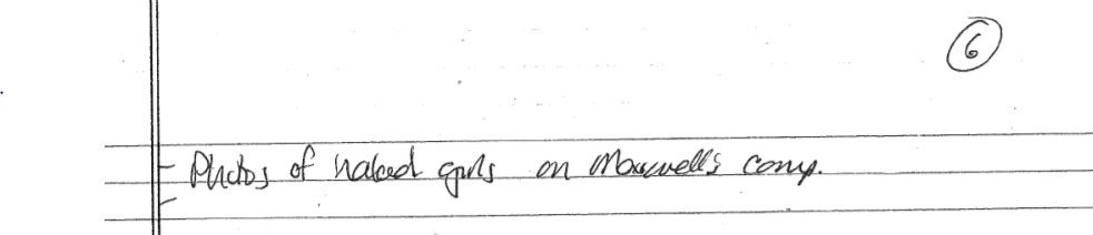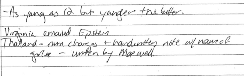 Las notas continúan: Niñas «desde los 12 años, pero más jóvenes, mejor». Notas de una visita a Tailandia con una nota escrita a mano «con el nombre de las niñas, escrita por Maxwell».