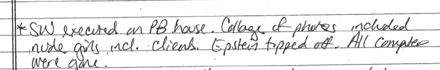 Con respecto a la orden de registro en la casa de Epstein en Palm Beach, alguien le advirtió a Epstein: “El collage de fotos incluía chicas desnudas incl. clientela. Epstein avisó. Todas las computadoras se habían ido «.