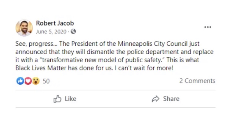Comentando sobre la decisión del Ayuntamiento de Minneapolis de «desmantelar el departamento de policía y reemplazarlo con un ‘nuevo modelo transformador de seguridad pública'», Jacob lo llamó «progreso», elogió Black Lives Matter (BLM) por inspirar la decisión, y terminó: «¡No puedo esperar más!»