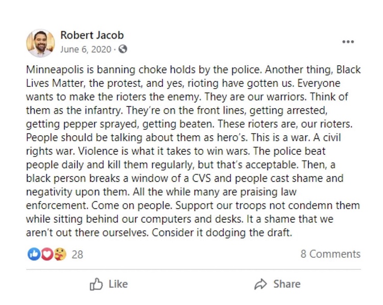 Al día siguiente, el 6 de junio, Jacob elogió a los alborotadores de BLM causando daños en varias ciudades estadounidenses. Llamó a los alborotadores «nuestros guerreros… nuestros alborotadores» y dijo que BLM estaba librando una «guerra de derechos civiles. La violencia es lo que se necesita para ganar guerras».