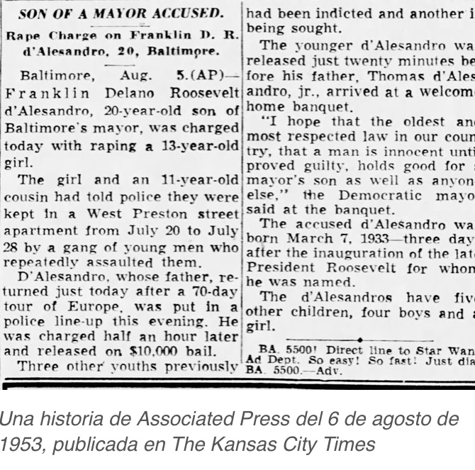 «Roosie regresó a Baltimore el martes por la noche», escribió Page. «Al mediodía del miércoles, él y su novia estaban entre el contingente disponible en la estación de tren de Mount Royal para dar la bienvenida a casa a sus padres y a Little Nancy. El tren de Baltimore y Ohio llegó justo a tiempo, a las 12:38 p.m. A partir de ese momento, el alcalde D’Alesandro estaría inmerso en esfuerzos frenéticos para defender a su hijo y proteger a su familia. Cuando llegaron a casa en Little Italy, llamó a su hijo al dormitorio principal. «Me dijo: «Dime la verdad. ¿Tuviste algo que ver con alguna chica? Roosie testificó más tarde. «Y le dije la verdad y dije ‘no'». Eso fue suficiente para su padre y su familia».