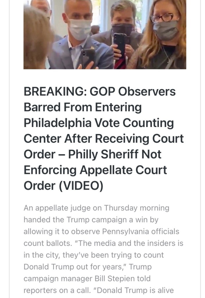 Después de las elecciones, a los republicanos se les impidió por la fuerza ver el contar las elecciones en Filadelfia. Los demócratas violaron la ley al impedir que los republicanos entraran en la sala, pero las fuerzas del orden no hicieron nada. Esto fue un shock para aquellos que creen en la ley y el orden.