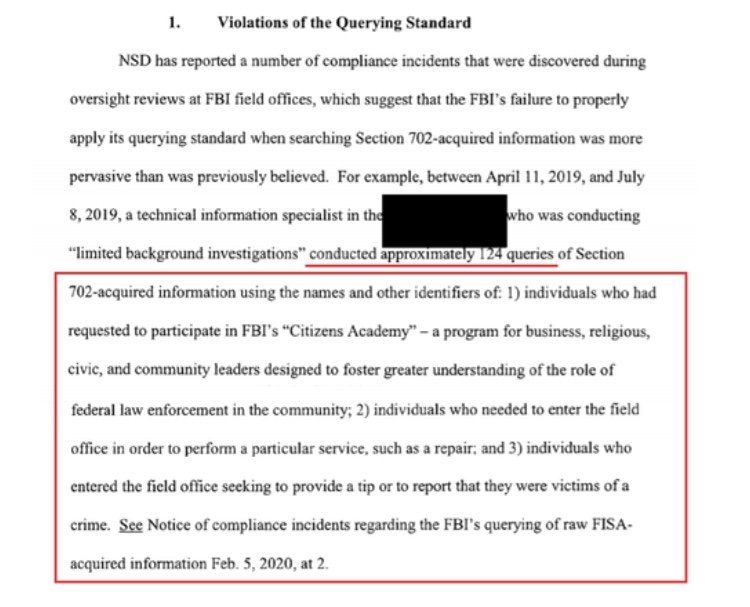 Abril de 2019 – julio de 2019: Un especialista en información técnica del FBI estuvo involucrado en «incidentes de cumplimiento» realizando 124 consultas de información adquirida por la Sección 702 sobre (1) Voluntarios que habían solicitado participar en la «Academia de Ciudadanos» del FBI; (2) Personas que necesitaban ingresar a la oficina local para realizar reparaciones; y (3) Personas que informaron que eran víctimas de un delito.