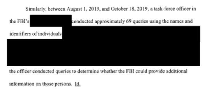 Agosto de 2019 – octubre de 2019: Una oficina del Grupo de Trabajo del FBI «realizó aproximadamente 69 consultas utilizando nombres e identificadores de individuos…» Las redacciones mantienen en secreto la identidad de las víctimas.