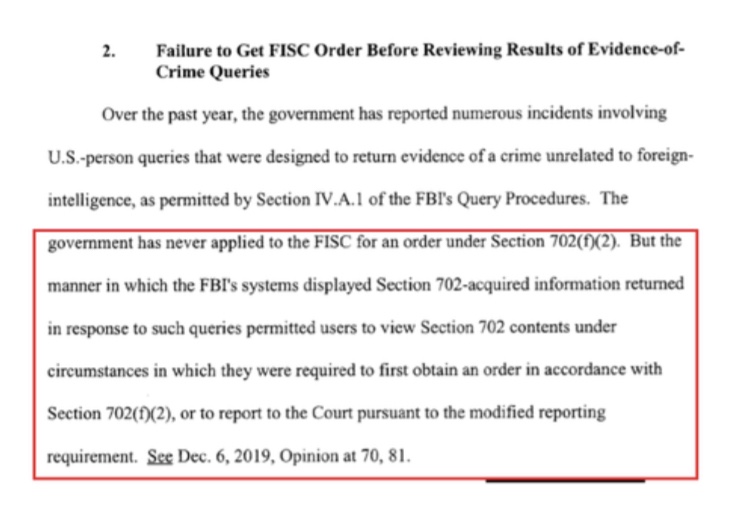 Una opinión y orden de la Corte FISA desclasificada hoy revela continuos abusos del FBI de «información cruda adquirida por FISA». Después de una revisión de la División de Seguridad Nacional del Departamento de Justicia, el Tribunal FISA señaló que «el hecho de que el FBI no aplicara correctamente su estándar de consulta al buscar la información adquirida en la Sección 702 era más generalizado de lo que se creía anteriormente«.