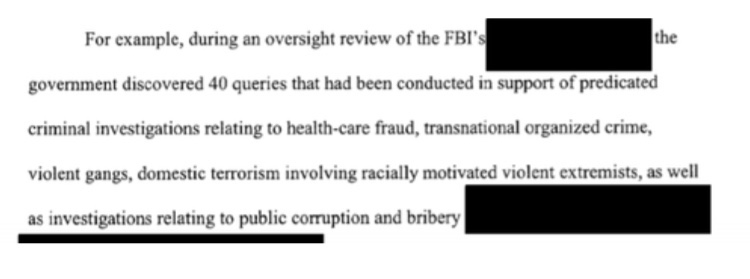 En otras palabras, el FBI está utilizando la información adquirida por FISA para investigar crímenes internos, no asuntos de inteligencia extranjera. Estas incluyeron investigaciones de «fraude de atención médica, crimen organizado transnacional, pandillas violentas, terrorismo doméstico que involucra a extremistas violentos por motivos raciales, así como investigaciones relacionadas con la corrupción pública y el soborno«.