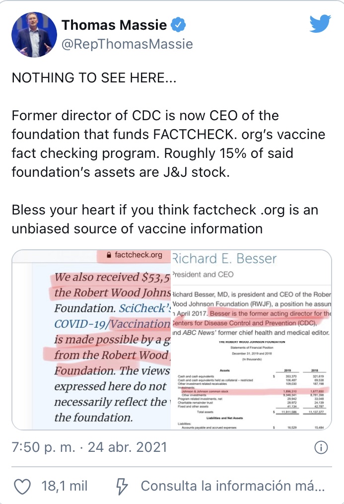 El representante estadounidense Thomas Massie, de Kentucky, tuiteó el sábado: «NADA QUE VER AQUÍ… El ex director del CDC es ahora director general de la fundación que financia el programa de comprobación de datos sobre vacunas de FACTCHECK.org. Aproximadamente el 15% de los activos de dicha fundación son acciones de J&J.