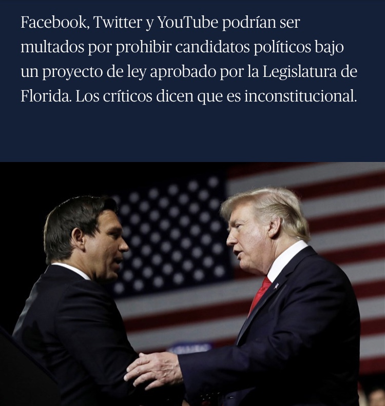 El gobernador. Se espera que Ron DeSantis, un republicano y aliado cercano de Trump que pidió la aprobación del proyecto de ley, firme la legislación en ley, pero la propuesta parece destinada a ser impugnada en los tribunales después de que un grupo comercial de la industria tecnológica la llamara una violación de los derechos de expresión de las corporaciones de la Primera Enmienda.