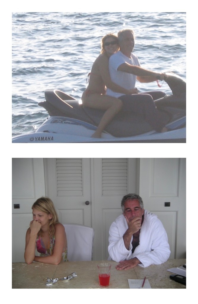Epstein está fotografiado conduciendo una moto acuática con una mujer que llevaba un bikini abrazándolo para sostenerlo.
