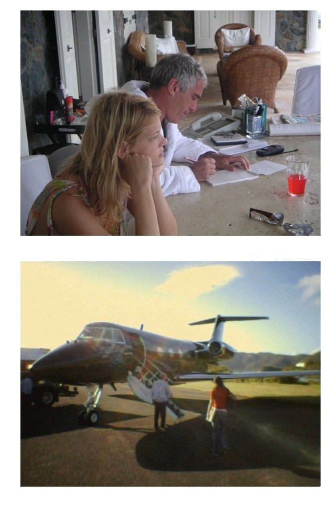 En otra foto, Epstein lleva una bata blanca y parece estar haciendo trabajo, mientras que una mujer rubia se sienta a su lado.