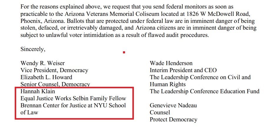Hannah Klain, hija del poderoso Jefe de Gabinete del Presidente Joe Biden, Ron Klain, firmó recientemente una carta instando al Departamento de Justicia a desplegar monitores federales para monitorear la auditoría del Senado del Estado de Arizona de los votos presidenciales de 2020 en el condado de Maricopa.