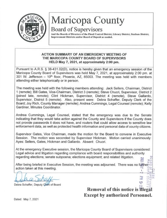 Ayer, la Junta de Supervisores del Condado de Maricopa celebró una reunión de emergencia para discutir su incapacidad para proporcionar routers y contraseñas a los auditores de los resultados de las elecciones de 2020 del condado: