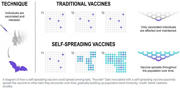 Las vacunas autodifundidas son esencialmente virus genéticamente diseñados para moverse a través de las poblaciones de la misma manera que las enfermedades infecciosas, pero en lugar de causar enfermedades, confieren protección. Construidas sobre el chasis de un virus benigno, las vacunas tienen material genético de un patógeno añadido a ellas que estimula la creación de anticuerpos o glóbulos blancos en huéspedes «infectados».