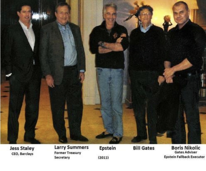 La foto, tomada en Mr. El hall de entrada revestido de mármol de Epsteins, muestra un radiante Mr. Epstein en zapatillas azules y doradas y un vellón decorado con una bandera estadounidense flanqueada por luminarias. A su derecha: James E. Staley, en ese momento un alto ejecutivo de JPMorgan, y el ex Secretario del Tesoro Lawrence Summers. A su izquierda: Sr. Nikolic y el Sr. Gates, sonriendo y usando pantalones grises y un suéter azul marino. –New York Times