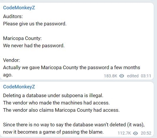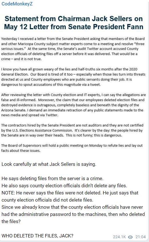 Anoche CMZ publicó una serie de publicaciones en Telegraph. En este primer post, CMZ proporciona un memorando del Presidente de la Junta de Supervisores del Condado de Maricopa (MCBOS), Jack Sellers. En él, Sellers etiqueta al Senado y a cualquiera que quiera realizar una auditoría legítima de los resultados del condado respaldando «mentiras y verdades a medias».