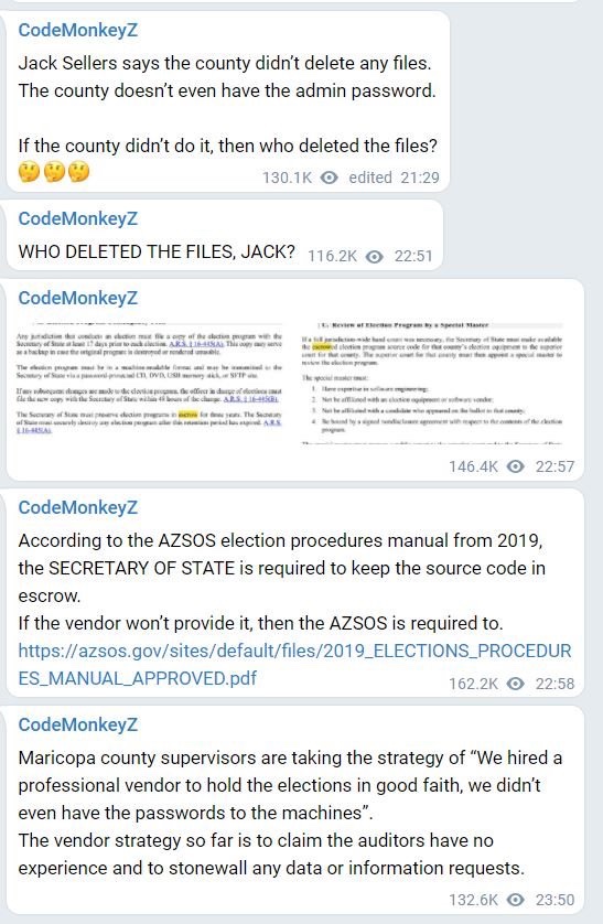 CMZ señala que hay leyes que hacen que la eliminación de archivos de este tipo relacionados con actos delictivos electorales. El Secretario de Estado de AZ está obligado a mantener el código fuente relacionado con cada elección. No sabemos si esto se hizo.