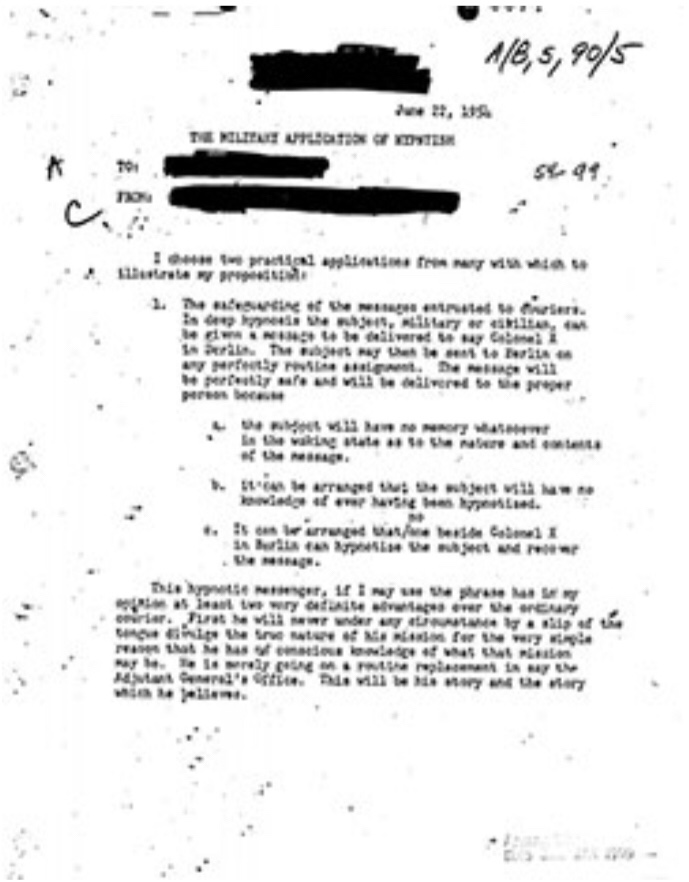 “Puedo hipnotizar a un hombre, sin su conocimiento o consentimiento, para que cometa traición contra Estados Unidos. Si yo puedo hacerlo, también podrían hacerlo los psicólogos de otras naciones en caso de otra guerra». MEMO PARA JEFE, DIVISIÓN DE CONTACTO DE (ELIMINADO) (ESDN: 0001108329)