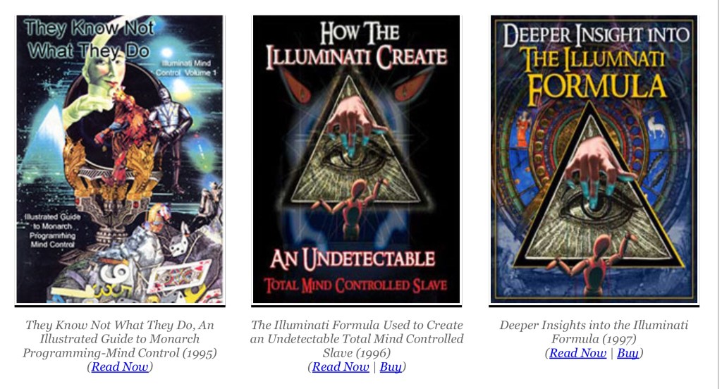 Escribieron 3 libros juntos. Ellos no saben lo que hacen, Una guía ilustrada para la Programación Monarca -‐‑ Control Mental en 1995, La Fórmula Illuminati Usada para Crear un Esclavo Totalmente Controlado por la Mente Indetectable en 1996 y Percepciones Más Profundas de la Fórmula Illuminati en 1997. Estos volúmenes influyeron enormemente en la desarrollo de la leyenda del Monarca.
