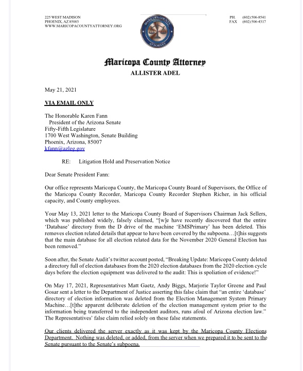 Aquí está la carta del Condado de Maricopa a Karen Fann: